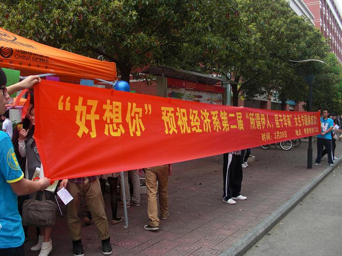 2012年3月20日中午12点,经济系生活部在明星饭堂前面举办了一个以“所谓伊人,匿于华商”为主题的女生节活动。为了筹备这个活动,生活部的众位成员都做好了精心的准备。