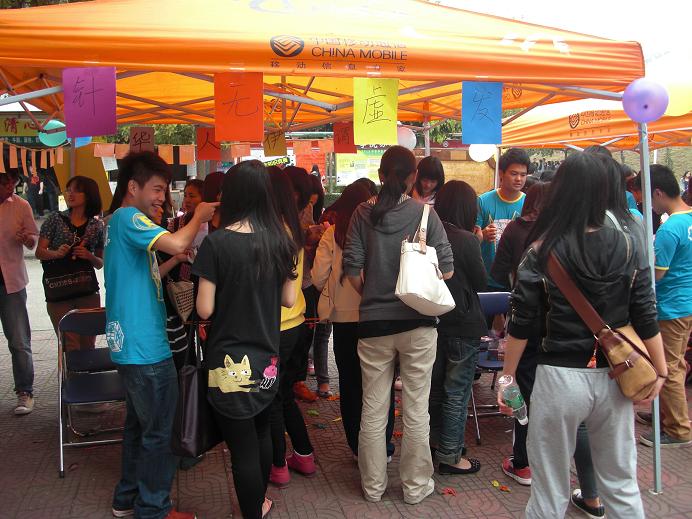 活动才刚开始,摊位周围便站满了人。这个只限于经济系的女生参加的活动由3个环节组成,女生们可以任选一个环节参加游戏,分别是“针无虚发”、“得心应手”、“幸不幸由你”。在活动现场,大部分女生都选择玩第3个环节,这是很靠运气的游戏,参与这个游戏的女生有机会获得大奖,但是运气不好的女生就只能获得一句话“女生节快乐”。如果不参与游戏,女生只要在横幅上签名也能得到一朵玫瑰花,现场的参与游戏的女生都是满脸笑容,非常满足。