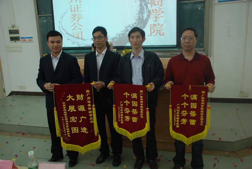 出席本次活动的嘉宾有广州证券公司新塘区的营业拓展部经理赖秋堤先生,营业部区域营销总监楚彪先生,营业部投资顾问主管魏克斌先生,营销总监何政先生,经济系主任王德高教授,经济系团总支书记杨思佳老师,证券沙龙指导老师张绍合,经济系学工助理黄国富老师,经济系学生会指导老师郭景荣老师,经济系艺术团指导老师黄素贞老师,经济系11级辅导员黄秋铭老师、廖小安老师,以及各系的学生干部代表。