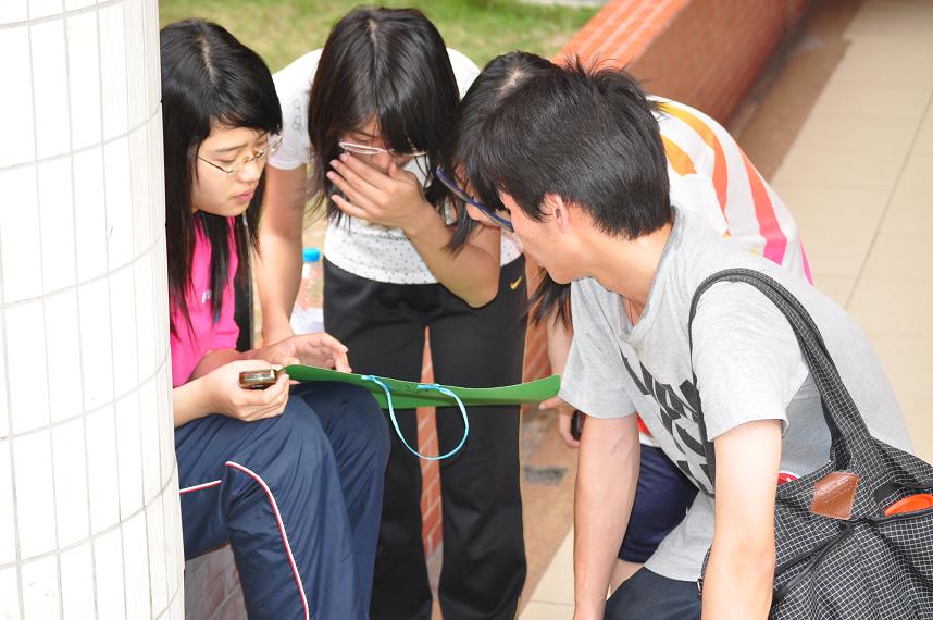 这次的活动吸引了很多同学参加,比赛一共分成了30个小组分别由A1—J3,每一个小组有3个队员。比赛规则就是工作人员分别在学校设下了50个埋伏点,每一队要根据信封中的提示找到其中的8埋伏点,然后解答埋伏点所给出的题目,用时最短、答题准确率的最高队伍就是最后的胜利者。