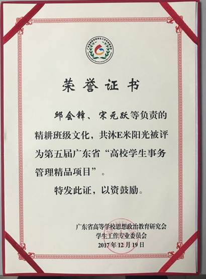 2017年12月,由经济与金融系邱会锋、宋元跃等负责品牌活动项目“精耕班级文化,共沐E米阳光——班级文化节”,在学院推荐下,经广东省高等学校思想政治教育研究会、学生工作专业委员会组织评审等环节,被评为第五届广东省“高校学生事务管理精品项目”。