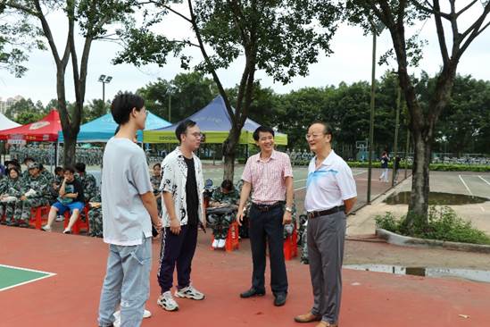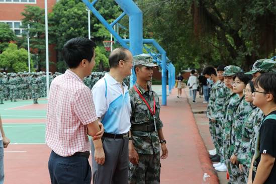 黄正新教授与军训教官进行亲切交谈,在休息期间一同看望正在训练的教官和新生,了解我系新生军训的具体情况和训练进程。黄教授提醒军训的同学们要劳逸结合,注意安全,避免意外事故的发生,并希望大家能够在军训过程中学习军人坚韧不拔的拼搏精神,发扬吃苦耐劳的优良传统。