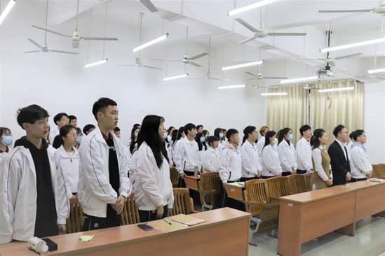 全体起立,面向团旗,奏唱团歌。
