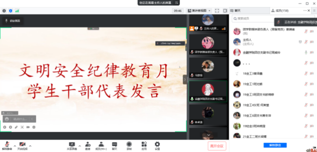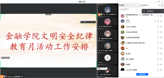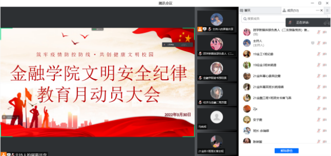 为响应我校文明安全纪律教育月活动的号召,增强我院学生的安全防范意识和自我保护能力,促进学生养成良好的学习和行为习惯,营造一个安全、健康、和谐的校园环境,我院决定于2022年3月21日-4月22日期间在全校范围内开展文明安全纪律教育月活动。为统一思想、精准落实,金融学院在3月30日召开文明安全纪律教育月活动动员大会。