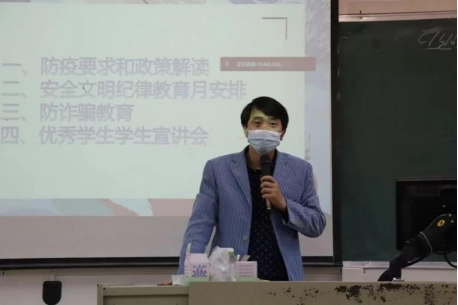 为规范广大学生言行举止,增强纪律观念、安全防范及疫情防控意识,帮助同学们养成良好的学习、生活和行为习惯,建设良好的院风、学风、班风,促进和谐校园建设,金融学院各班级在文明安全纪律教育月活动期间,采取线上与线下相结合方式开展了 “筑牢疫情防空防线,共创健康文明校园”主题班会,主要讲述了校园文明、校园教育、防诈骗宣传、疫情防控、纪律学风、优秀学生宣讲会等方面的内容。