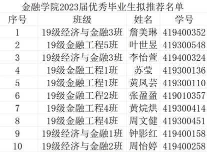 现对金融学院2023届优秀毕业生拟推荐名单进行公示,名单如下: