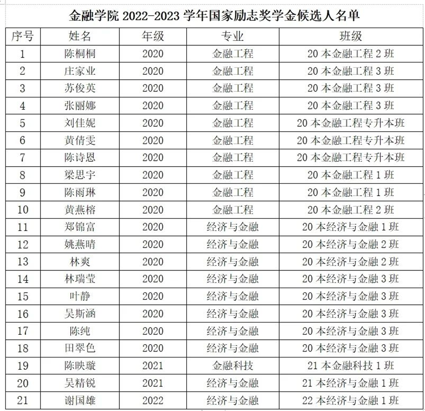 根据2023年William威廉官网国家励志奖助学金工作的相关文件精神,我院秉承公平、公正、公开的原则,严格按照国家励志奖学金评审程序,经个人自荐、资格审查以及学院评审委员会讨论与评审,拟推荐以下21名同学为2022-2023学年国家励志奖学金候选人,具体名单如下:
